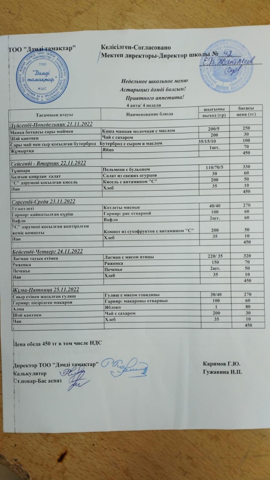 Мектеп асханасының апталық ас мәзірі » СШ №42