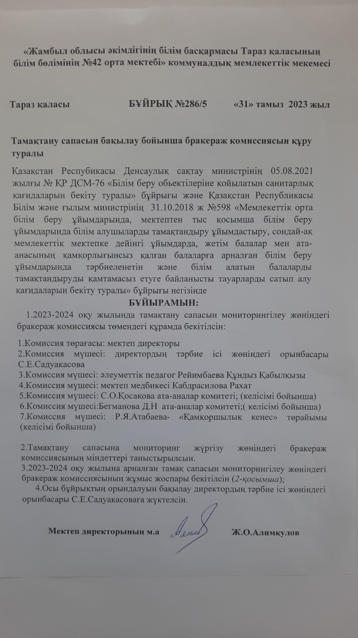 Тамақтану сапасын бақылау бойынша бракераж комиссиясын құру туралы » СШ №42