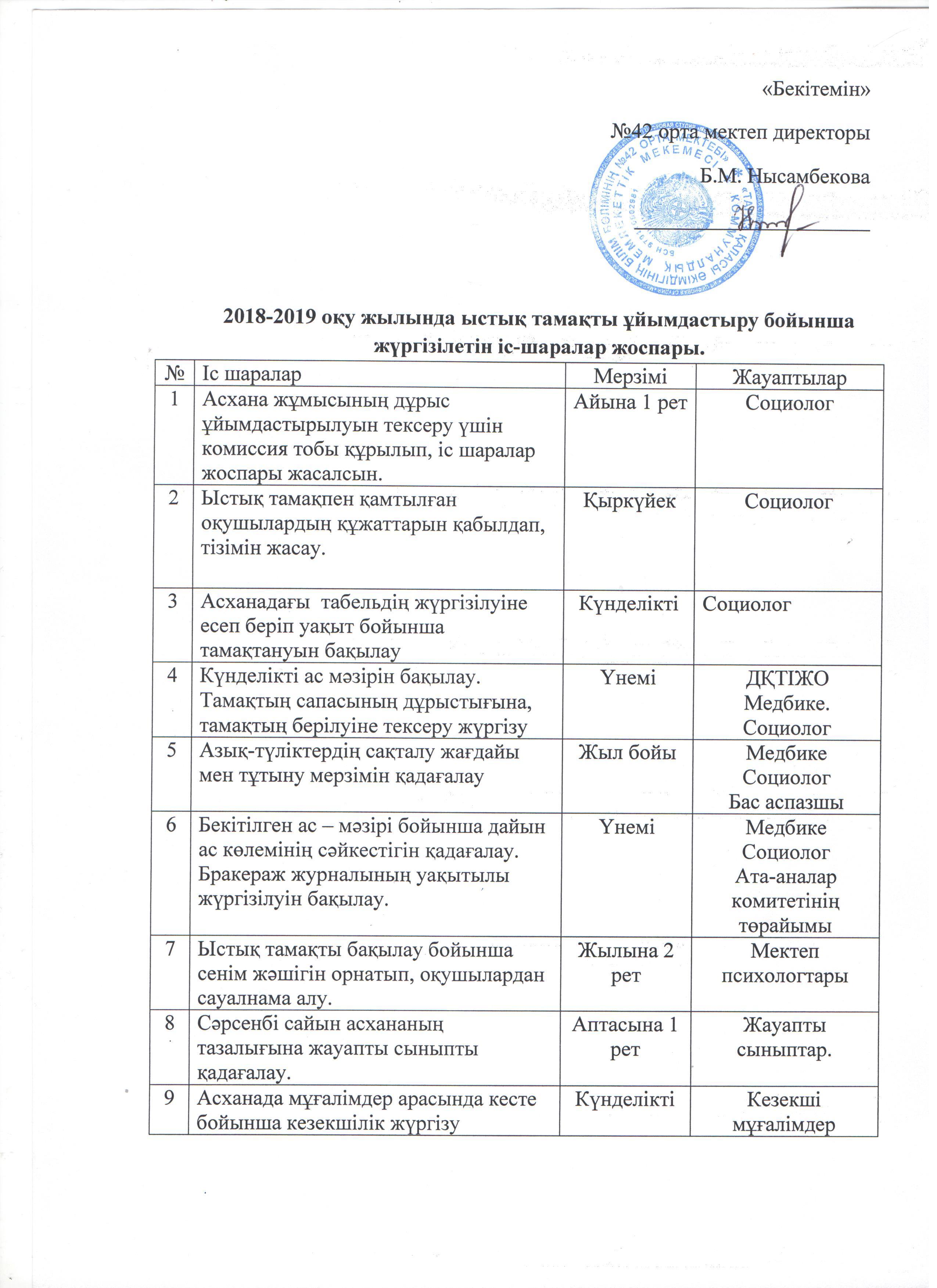 Ыстық тамақты ұйымдастыру бойынша жүргізілетін іс-шаралар жоспары » СШ №42