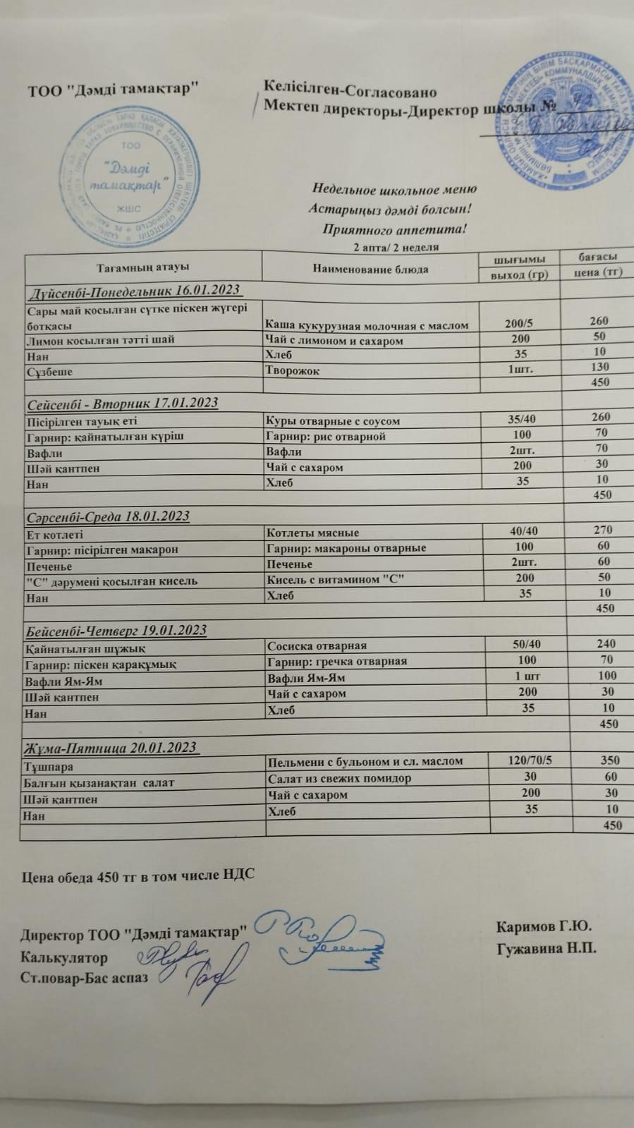 Мектеп асханасының 16.01-20.01.2023 ж апталық ас мәзірі » СШ №42